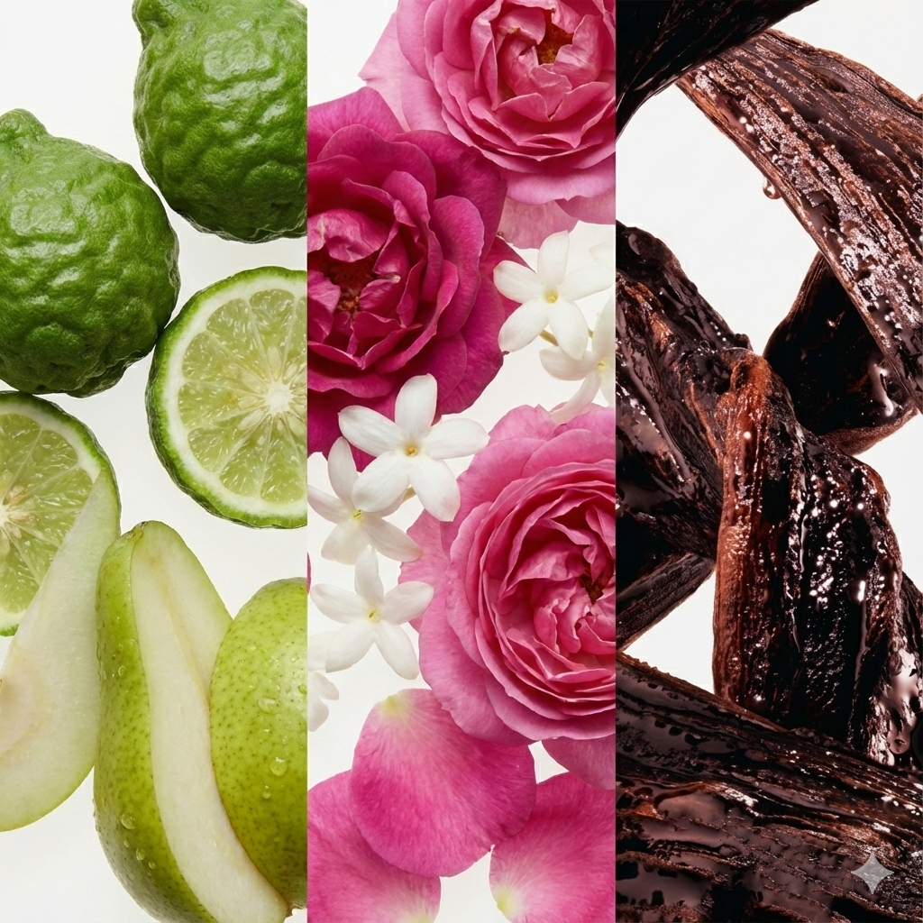 Notas de Topo: O frescor vibrante e suculento da Bergamota e Pera.