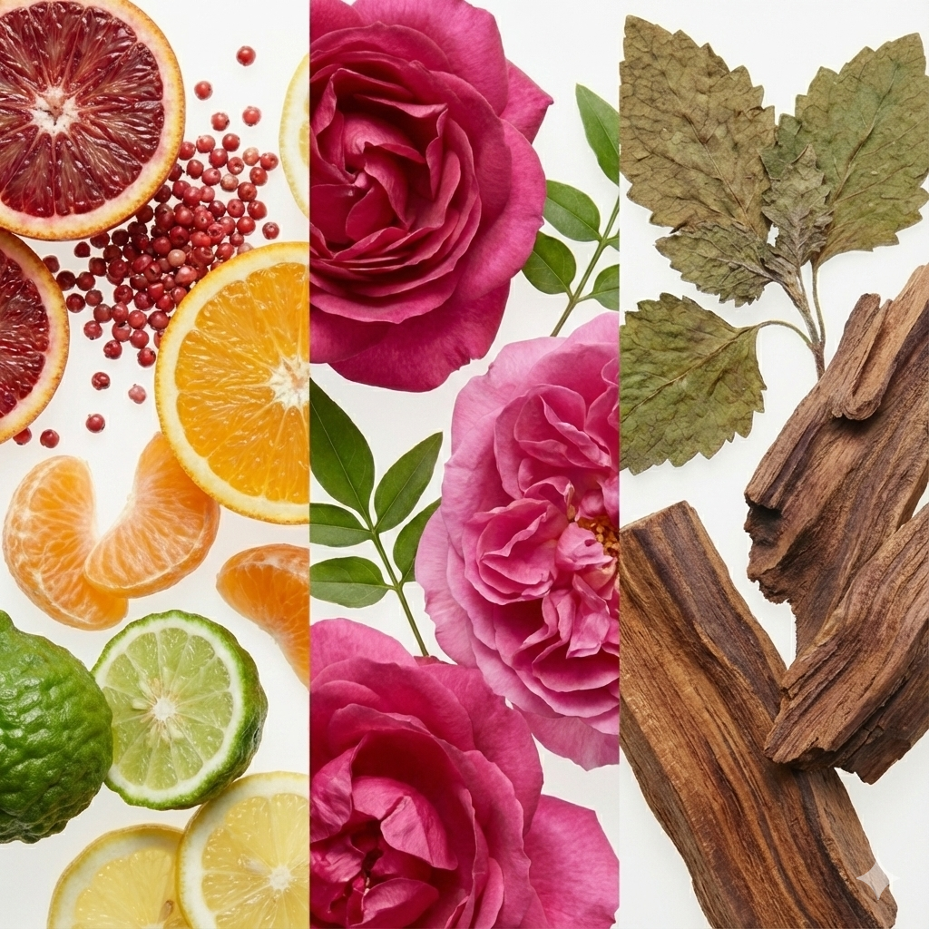 A abertura é uma explosão de frescor com notas de laranja sanguínea e pimenta rosa, que conduzem a um coração floral majestoso, protagonizado pelas Rosas de Grasse e Damascena. O fundo de patchouli e jacarandá confere estrutura e personalidade, criando um rastro sofisticado e inesquecível.