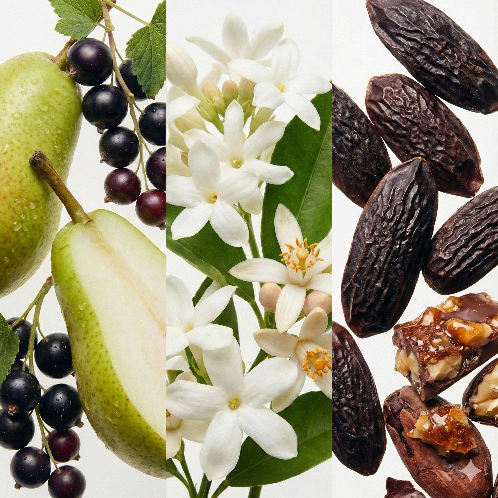 A fragrância é luminosa e irresistível. A abertura frutal suculenta de pêra e cassis traz um sorriso imediato, evoluindo para um coração floral nobre de jasmim e flor de laranjeira. O fundo é a assinatura inconfundível desta criação: uma base doce e envolvente de pralinê, baunilha e fava tonka, que confere conforto e um rastro viciante. É o equilíbrio perfeito entre elegância e indulgência, deixando a pele macia e deliciosamente perfumada.