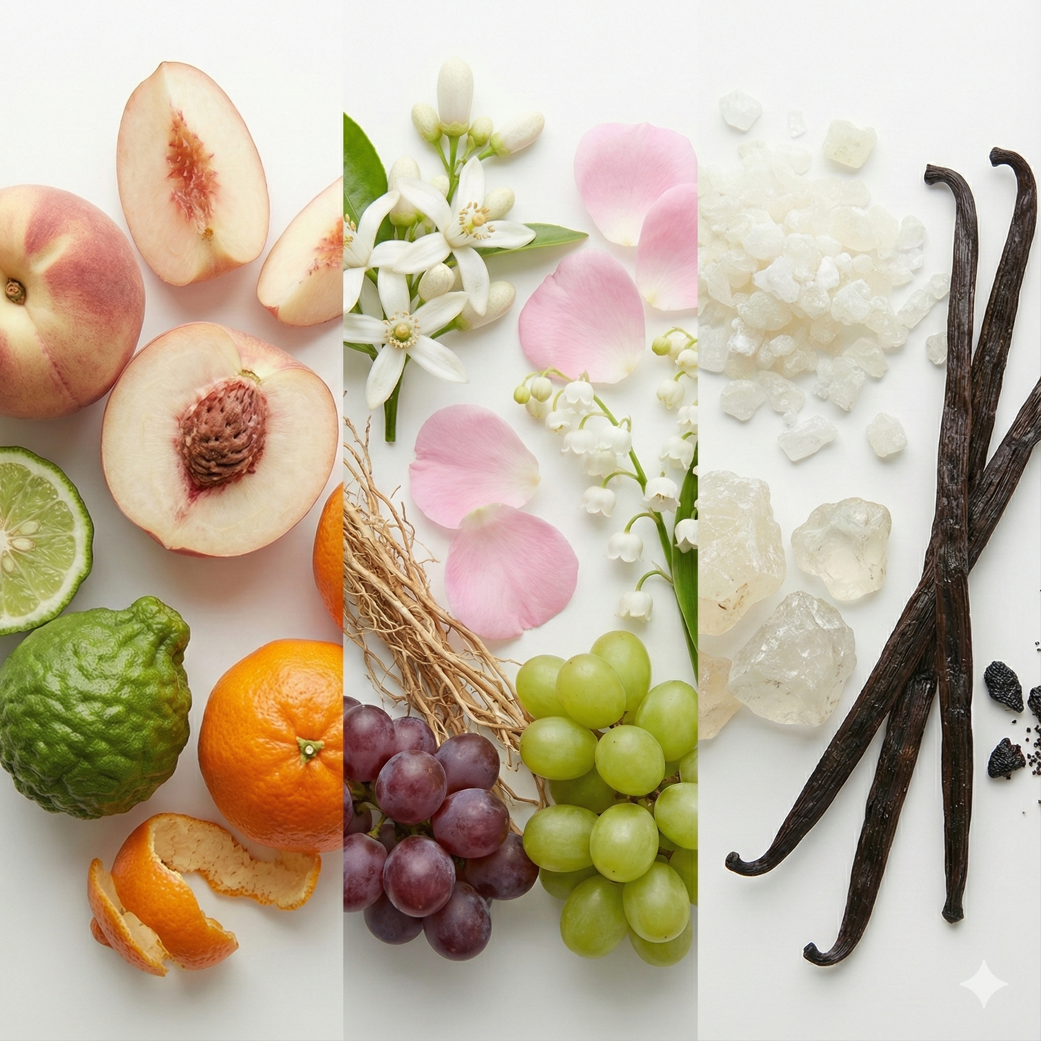 A composição é uma obra-prima de texturas. A abertura é luminosa e macia, onde a suculência delicada do pêssego branco se mistura ao frescor cítrico da bergamota e da mandarina. O coração revela uma feminilidade moderna e radiante: a flor de laranjeira e o lírio-do-vale dançam com a petalia e a nota inusitada de uva, equilibradas pela estrutura elegante do vetiver. O fundo cria um efeito de "segunda pele" viciante, com o conforto do almíscar e a projeção moderna do ambroxan, aquecidos por um toque sutil de baunilha.