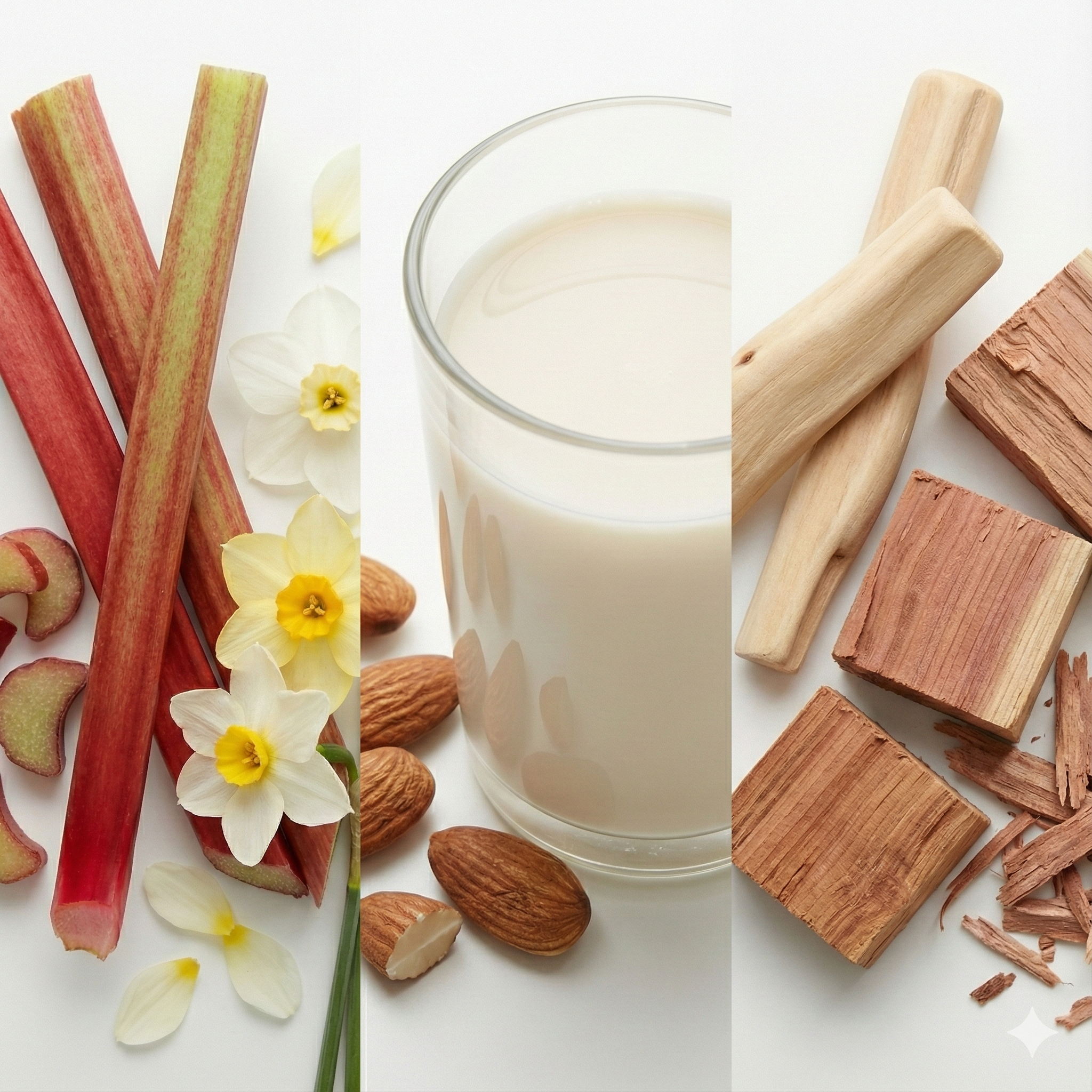 A abertura é luminosa e inesperada, onde o toque ácido e suculento do ruibarbo se encontra com a elegância solar da flor de narciso. O coração revela a alma desta criação: a nota de leite de amêndoa traz uma textura macia, leitosa e nostálgica. O fundo de cashmeran (madeira de cashmere) e cedro confere um acabamento aveludado, limpo e sofisticado, garantindo uma fixação íntima e duradoura.