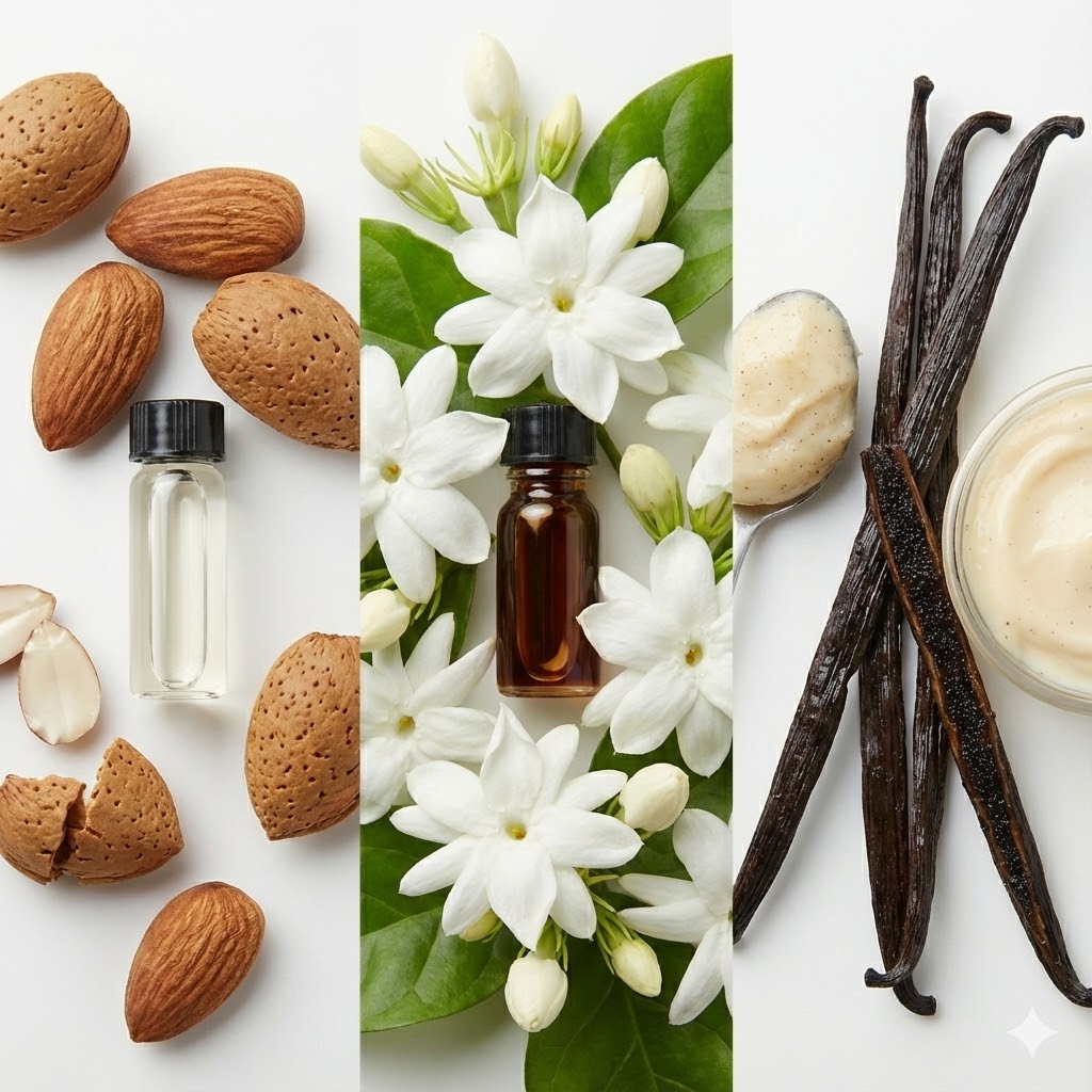 A composição abre com a personalidade marcante da amêndoa amarga, evoluindo para a opulência luxuosa do jasmim sambac. O fundo é dominado por uma baunilha quente e cremosa, que envolve a pele com uma sensualidade intensa e duradoura.