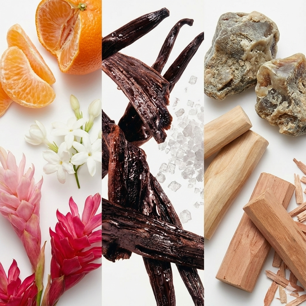 A composição abre com a luminosidade da tangerina e da flor de gengibre, evoluindo para um coração magnético onde a doçura da baunilha é realçada por um toque inusitado de sal. O fundo de madeira de cashmere e ambargris confere uma sofisticação envolvente e duradoura.