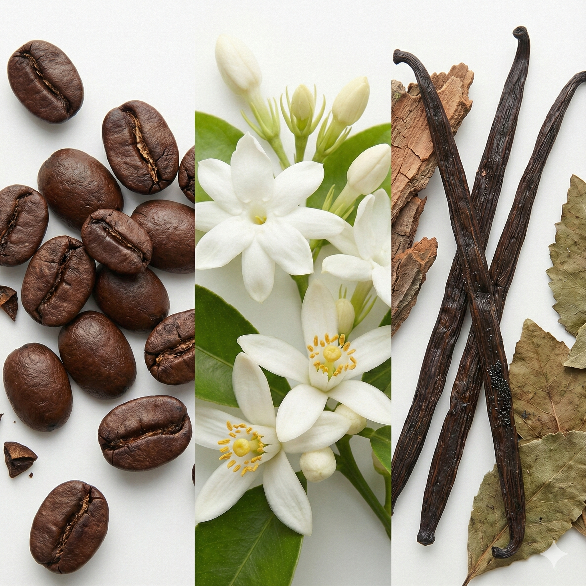 A abertura desperta os sentidos com a nota vigorosa dos grãos de café, criando um impacto imediato. O coração traz suavidade e luz com o jasmim sambac e o absoluto de flor de laranjeira. O fundo é o segredo do vício: a baunilha doce se mistura ao cedro e patchouli, conferindo profundidade, calor e uma elegância misteriosa.
