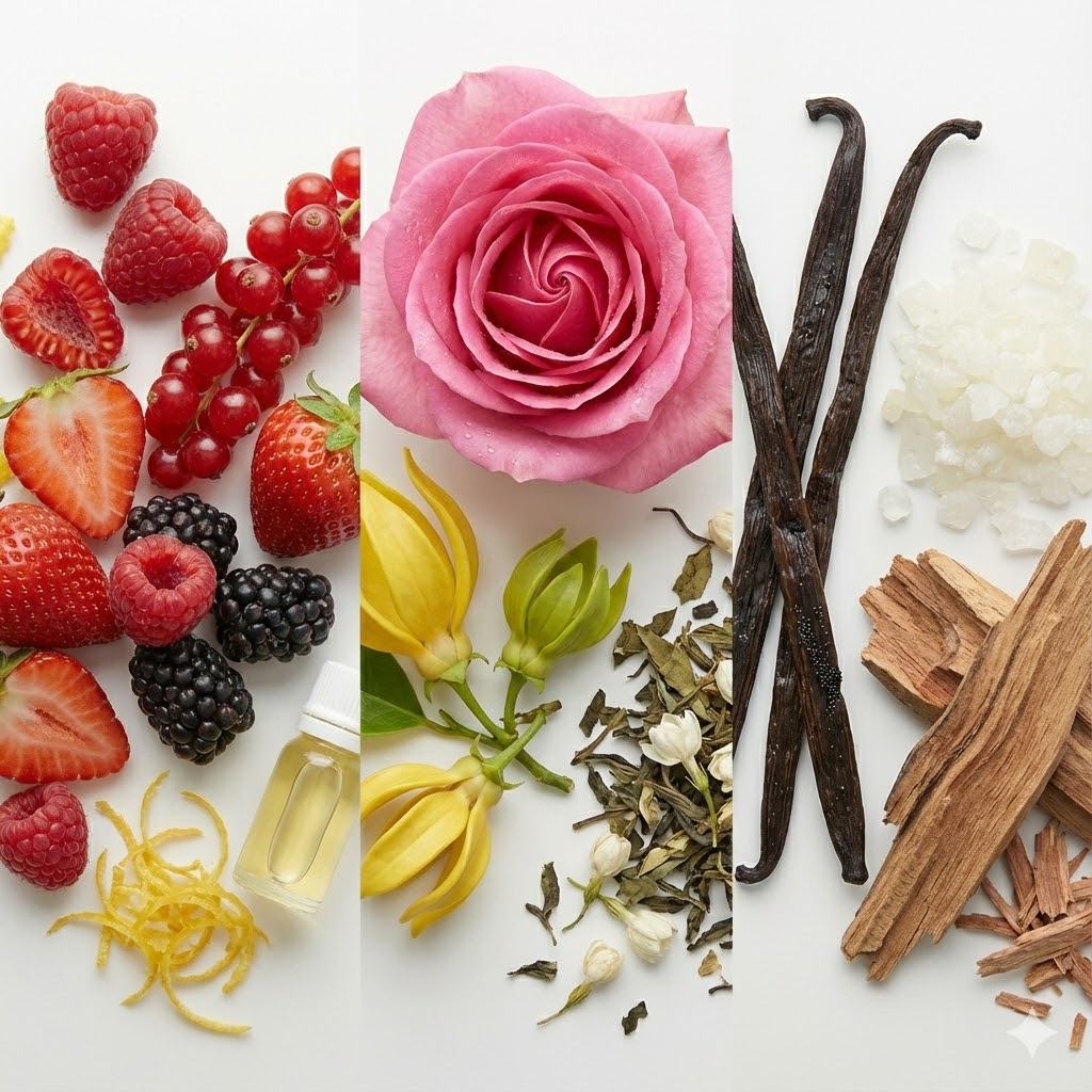 A abertura é um convite sorridente, onde a acidez brilhante da essência de limão realça o sabor doce e viciante das frutas vermelhas e da framboesa. O coração revela a alma elegante da composição: um acorde refinado de chá de jasmim se entrelaça com a sensualidade da rosa e o exotismo solar do ylang-ylang. O fundo traz conforto e duração, com a baunilha e o almíscar criando uma base macia, sustentada pela estrutura nobre do cedro.