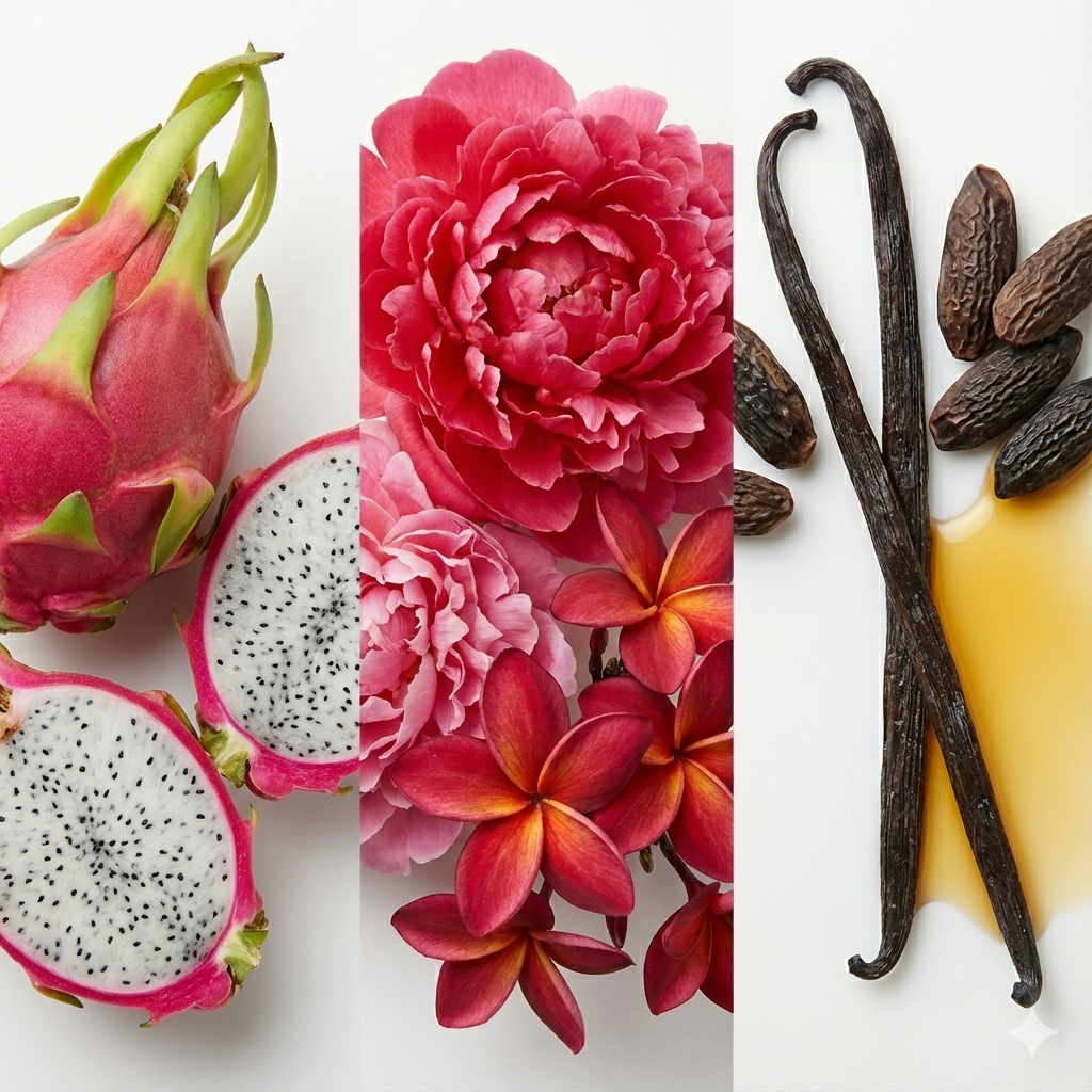 A abertura é exótica e revigorante, dominada pela nota vibrante de pitaya (fruta do dragão), que traz uma suculência aquosa e doce na medida certa. O coração transporta os sentidos para uma ilha paradisíaca, combinando a cremosidade floral da plumeria vermelha (frangipani) com o toque frutado e romântico da peônia cereja. O fundo é o abraço dourado do pôr do sol: uma baunilha solar que aquece a pele, deixando um rastro doce, confortável e iluminado.