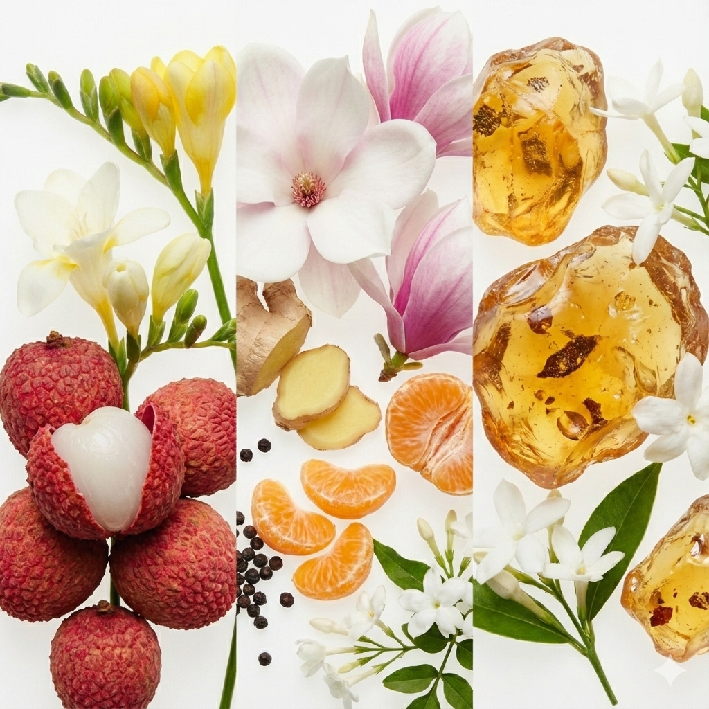 A abertura frutal e fresca da lichia e frésia desperta os sentidos, evoluindo para um coração surpreendente onde a delicadeza da magnólia encontra a energia picante do gengibre e da pimenta. O fundo de âmbar confere um rastro sensual e envolvente.