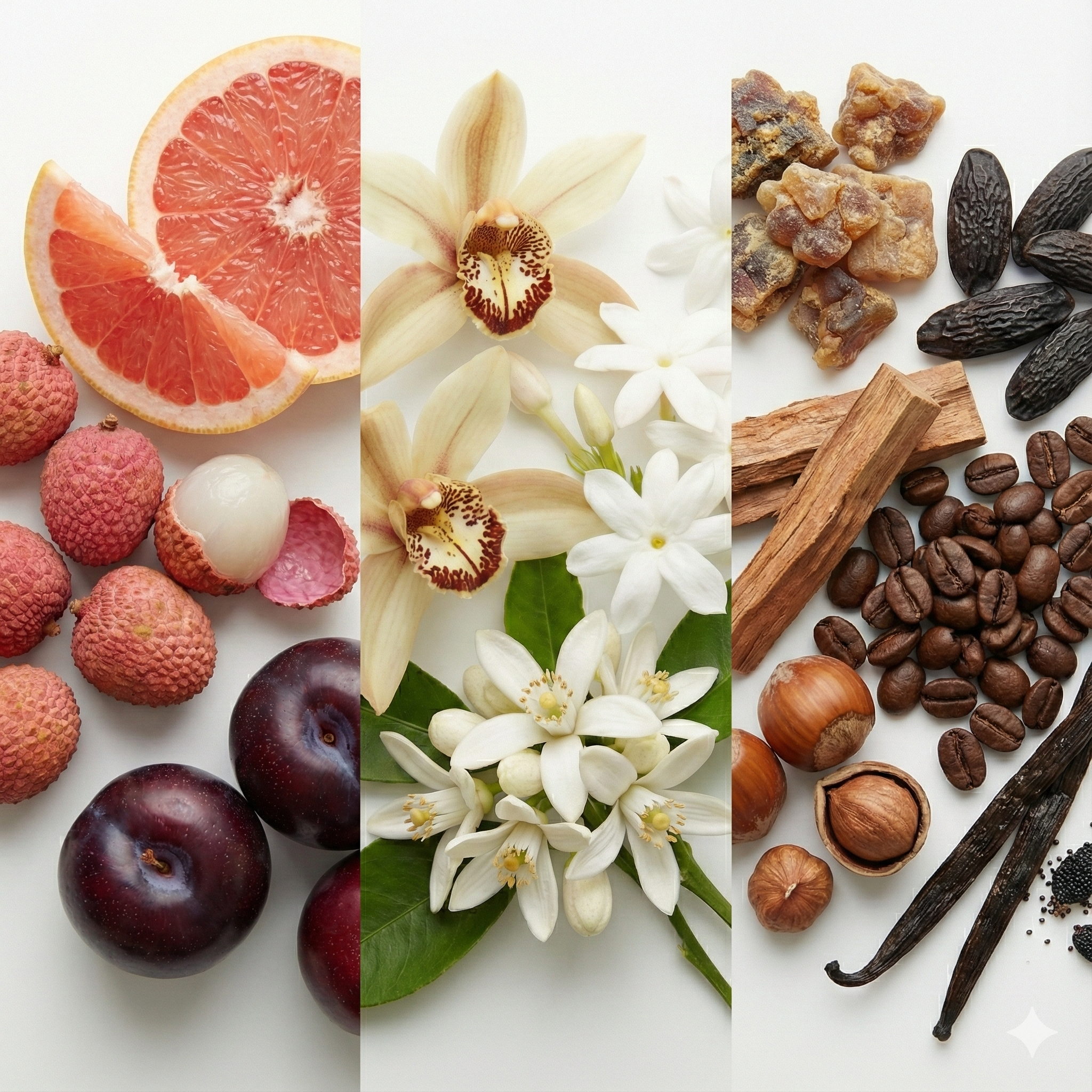 A abertura é suculenta e vibrante, onde o frescor da toranja contrasta com a doçura néctar da lichia e o caráter escuro da ameixa. O coração revela uma feminilidade envolvente com a orquídea baunilha e flores brancas. O fundo é o ápice da sedução: uma base rica e cremosa onde o aroma torrado do café e a textura da avelã se fundem à baunilha, benjoim e fava tonka, criando uma assinatura inesquecível.