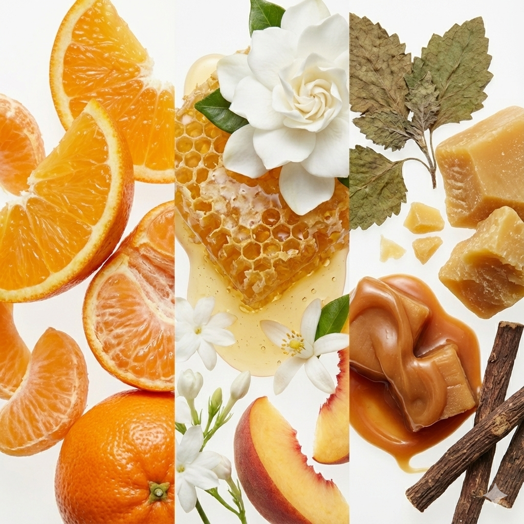 A abertura cítrica de laranja e tangerina traz frescor, mas logo cede espaço para um coração opulento onde o mel e a gardênia reinam absolutos. O fundo é quente e profundo, marcado pelo patchouli, caramelo e cera de abelha, criando uma aura de sensualidade extrema.