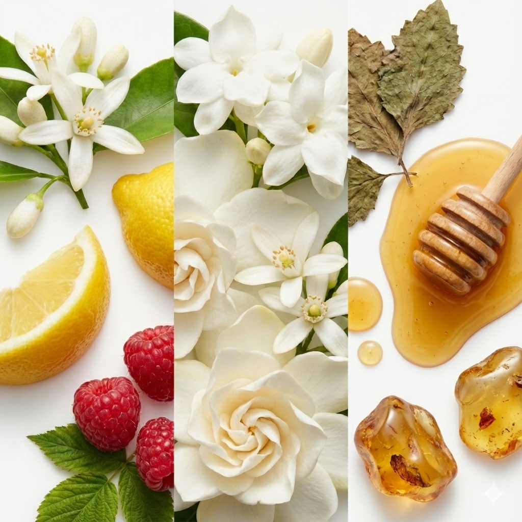 Notas de Topo: O frescor cítrico do Limão Amalfi e Néroli com a doçura da Framboesa.