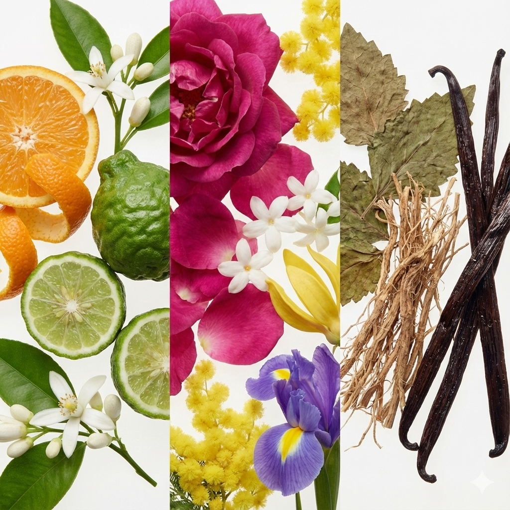 A composição abre com a vitalidade cítrica da laranja e bergamota, despertando os sentidos para um coração floral luxuoso e texturizado, onde a rosa turca e o jasmim se unem à sofisticação da íris. O fundo de patchouli e vetiver, aquecido pela baunilha, confere um rastro profundo, moderno e irresistível.