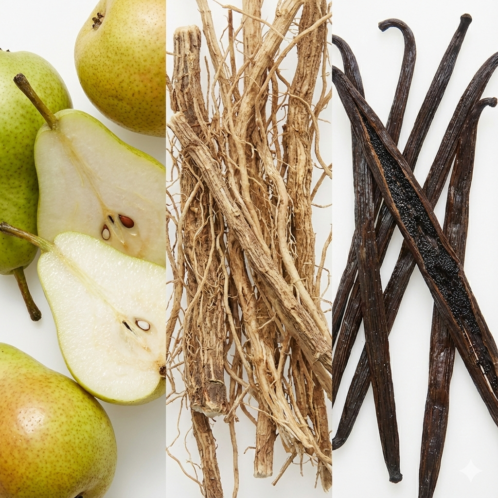 A abertura é dominada pela nota suculenta e açucarada da pera verde, que desperta o paladar. O coração traz o vetiver, conferindo uma textura terrosa e sofisticada que quebra o excesso de doçura, enquanto o fundo de baunilha envolve a pele em uma aura cremosa, quente e absolutamente irresistível.