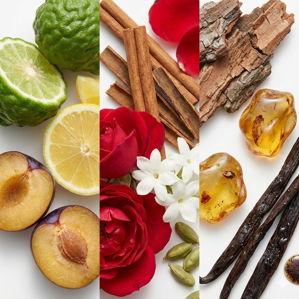 A abertura combina a energia da bergamota e limão com o toque suculento da ameixa. No coração, a canela e o cardamomo trazem uma picância sofisticada, que é abraçada por um fundo quente e amadeirado de âmbar, cedro e baunilha.